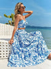 This beautiful set includes a short camisole with a twisted front and a flattering off-the-shoulder neckline, paired with a long, elegant skirt. The ruffle hem and all-over floral print in blue and white enhance the bohemian style, making it perfect for summer. Made from a blend of polyester and elastane, this set offers a regular fit with non-stretch fabric for a lightweight feel. It's ideal for making a statement while staying cool and comfortable.