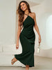 Elegant violet halter-neck camisole dress with a backless, knotted, and gathered design. The long, color-block silhouette creates a sophisticated look—perfect for weddings, festive occasions, or formal celebrations.