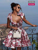 This women’s floral print A-line dress features a strapless neckline, tie waist, and flared hem. Perfect for vacations, garden parties, and summer evenings, combining elegance with playful boho charm.