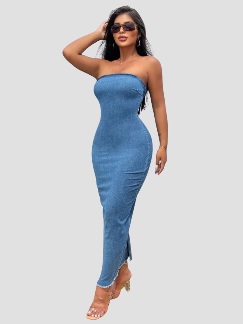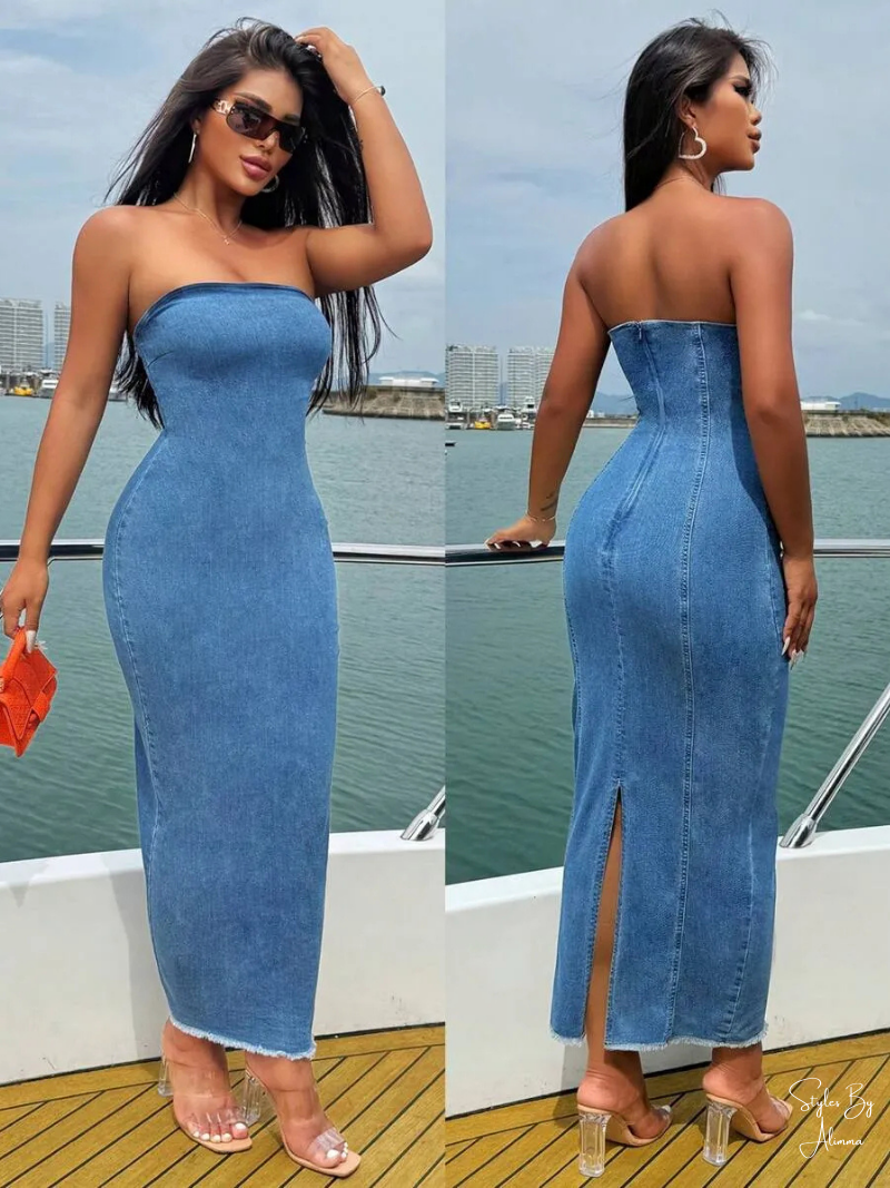Women's Denim Dress with slit and frayed edge, designed for vacations and casual outings. A stylish strapless bodycon piece that flatters your figure with comfort and elegance.
