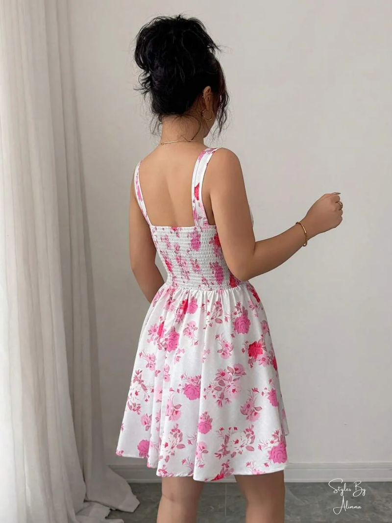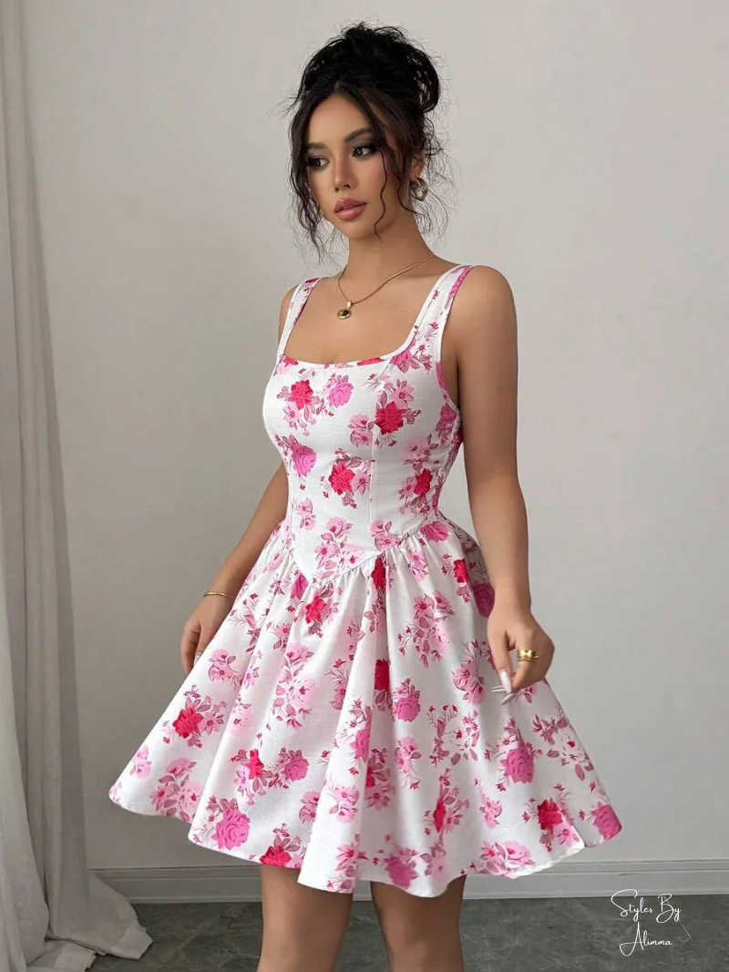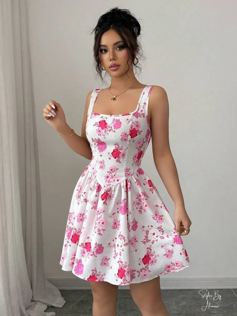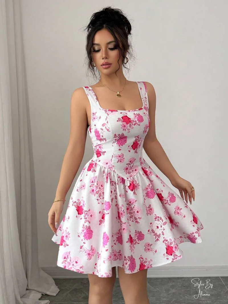 Elevate your summer wardrobe with this sleeveless square neck floral print dress. Designed with a cinched high waist, backless detail, and slim fit, perfect for romantic outings and beach getaways.