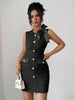 Elegant pink striped mini dress with a round collar, pencil hem, and sleeveless cut. Perfect for office or festive occasions, featuring chic knots, fake pockets, and a hidden zipper for a refined finish.