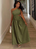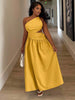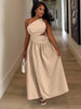 This graceful long dress is designed for effortless sophistication during warmer seasons. Crafted in a flowing woven fabric, it features delicate spaghetti straps, a high-waist silhouette, and a flattering A-line shape. The asymmetric hollow-out back with cross-tied detailing adds a modern, alluring touch, while ruched accents and a discreet zipper ensure a smooth fit. Ideal for weddings, vacations, or elevated business casual styling, this dress balances elegance and comfort beautifully.