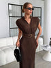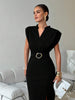 Elegant black midi bodycon dress with deep V neckline, dolman sleeves and slimming fit, perfect for office, commuting, graduations and vacations, offering versatile, modern style with comfortable stretch and confidence.