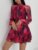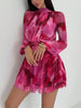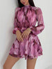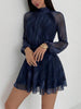 Chic slim fit mini dress with stand collar, ruched detailing, and tie back design, crafted in stretchy fabric, perfect for vacations, casual outings, and stylish festive moments with effortless elegance.