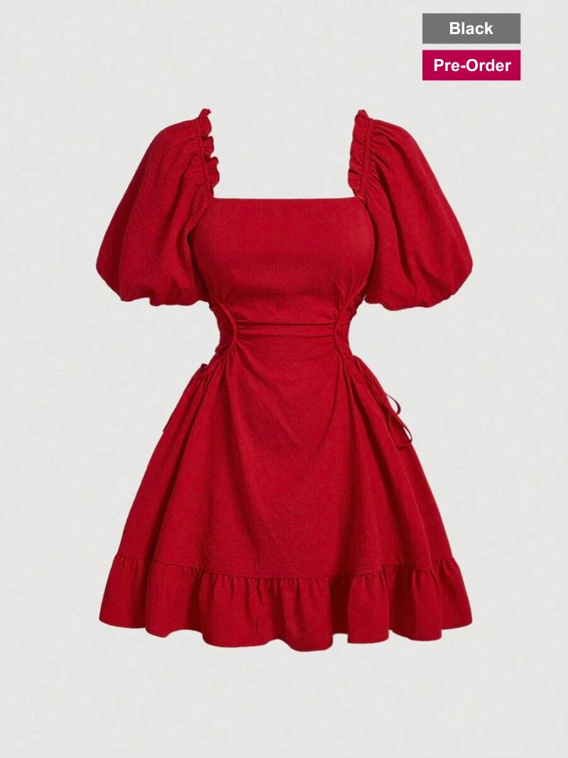 1 x Women's Square Neckline Puff Sleeve Tie Side Dress