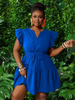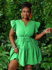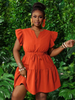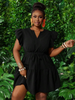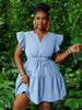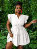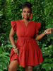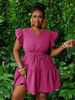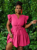 Chic hot pink mini dress with notched collar and flutter sleeves. Designed with ruffles, drawstring details, and flounce hem. Semi-sheer, casual vacation style, slim fit A-line cut, perfect for carnival.