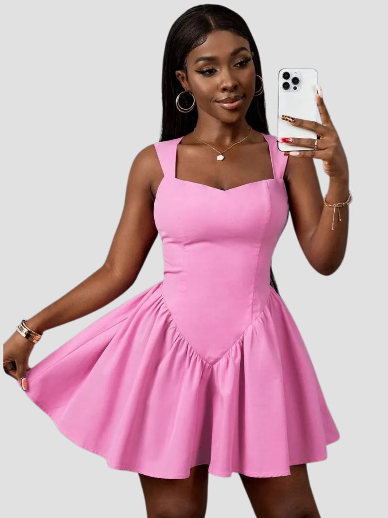 Elegant Keyhole Neck Sleeveless Backless A-Line Princess Dress in pink, perfect for weddings and festive occasions. A chic, breathable summer outfit designed with a ruffle hem and flattering mini silhouette.