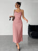 Elegant brown spaghetti strap mermaid dress with a draped, backless design. Crafted from woven fabric, this long formal evening gown enhances feminine curves with timeless sophistication and refined style.