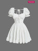 This adorable white A-line dress is designed with a sweetheart neckline, puff sleeves, and charming tiered layers. The frill and knot details add a playful touch, making it perfect for casual and cute looks.