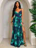 Boho green tie dye maxi sundress with spaghetti straps, lace up wrap detail, high waist pleats and thigh slit, perfect for festivals, vacations, concerts, and effortless spring summer styling.